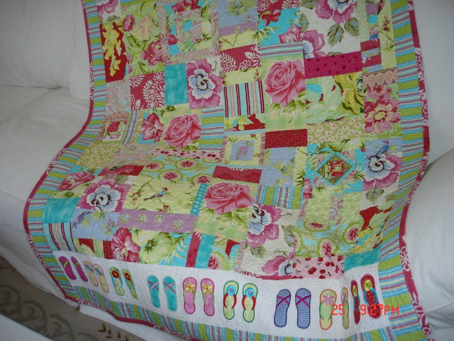 | Design Source - Description | Made for my daughter Keri in celebration of her honeymoon and marriage to her dream man. Used embroidery designs for thongs from Paw designs. |