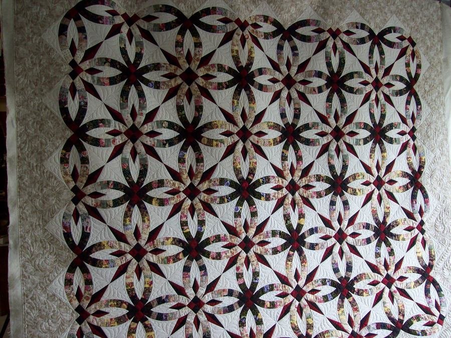FromRagsToStitches Double Wedding Star Masterpiece - Gale Wilson pieced/paper pieced this stunning Double Wedding Star pattern by Judy Neimeyer as a gift for her daughter. Due to a deadline, this award winning hand quilter, decided to have this beautiful masterpiece machine quilted. I was honored to be a part of this beautiful family heirloom.