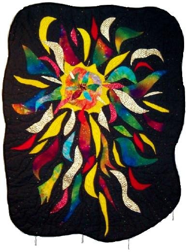 TigerQuilter From Sadness to Joy - This quilt is made on a black cotton background, the colored pieces are cotton and Dupioni silk raw-edge applique accented with beading.