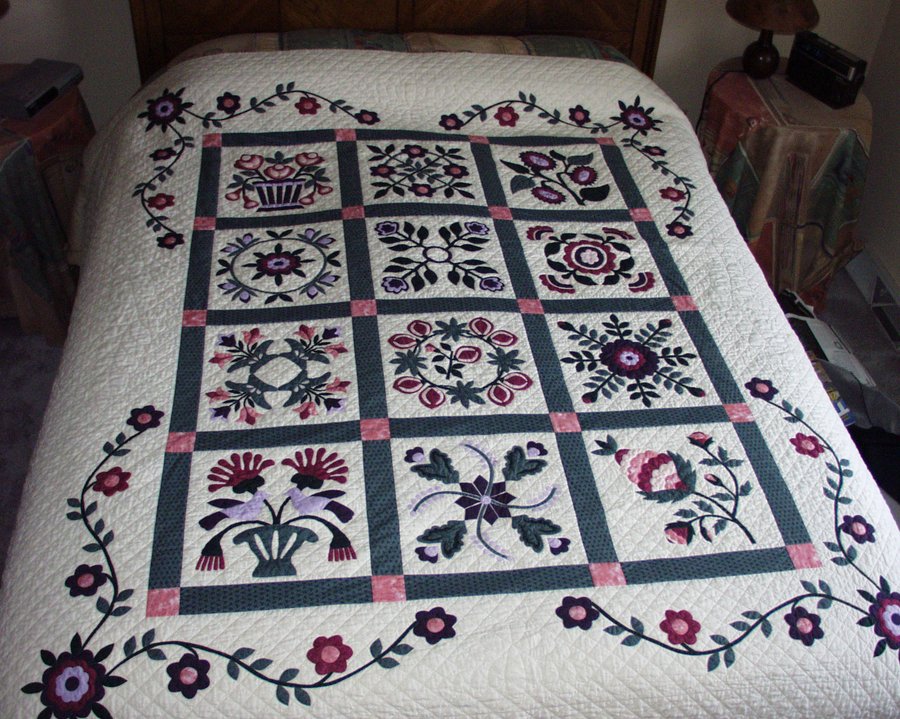 | Design Source - Description | Block designs were taken from Jeanna Kimball's books, applique'd and assembled in a traditional style. The border applique' is original but in Jeanna's style. |
