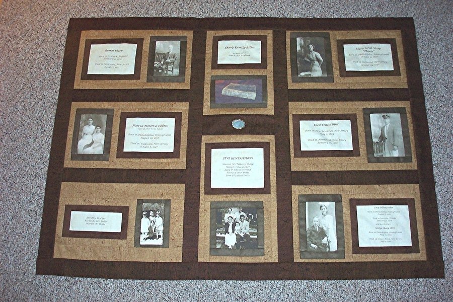 ann6340 Genealogy Quilt - Memory Quilt showing pictures of family members and information printed onto fabric using Microsoft Publisher and Word. Picture of Sharp family bible and picture of family heirloom broach.