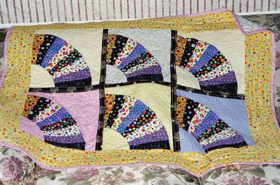 frostypurp Grammy's Fan 1.0 - This is a miniature version of a full sized quilt that I made for myself. My grand daughter just had to have one "just like grammy's" so I made a mini version just for her. I used "spot" themed fabric so it isn't a usual grandmother's fan.