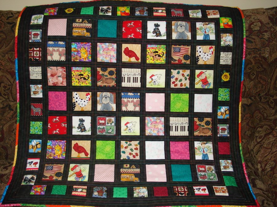 | Design Source - Description | I decided to "fussy cut" two of every square - two matching 3" sqaures in the center, and two matching 2" squares in the border. This is going to my 19 month old granddaughter who will have fun finding the two blocks that match. |