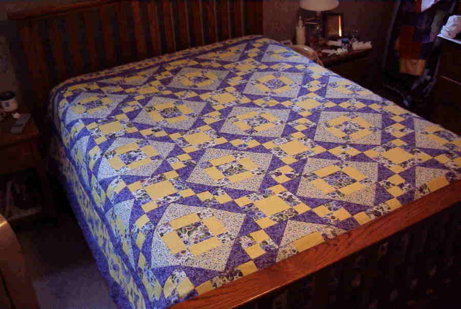 RobinDelgado Deb's Wedding Quilt - This is a quilt I made for my sister when she got married. We actually had used the Pansy fabrics for her table runners at her wedding. Then I disassembled them and made them into her quilt. I actually started her quilt while on a mini retreat at Ocean Shores with my second sister. It was nice to quilt as long as we wanted, wander on the beach, visit a local Quilt Show and shop in town.