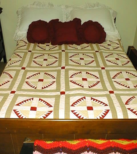 | Design Source - Description | We have not been able to find this block elsewhere, so far. My great-grandmother made this quilt around the turn of the century in SE Missouri. I think that the tan pieces were originally green. |