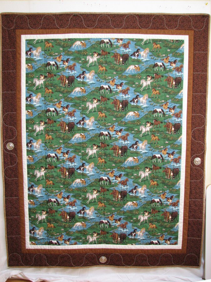 | Design Source - Description | This is my first attempt at free hand machine quilting. I made a pillow case to go with the quilt. I added the metal conchos to make it look more cowboyish. The back is flannel with Pine Cones. A perfect match. |