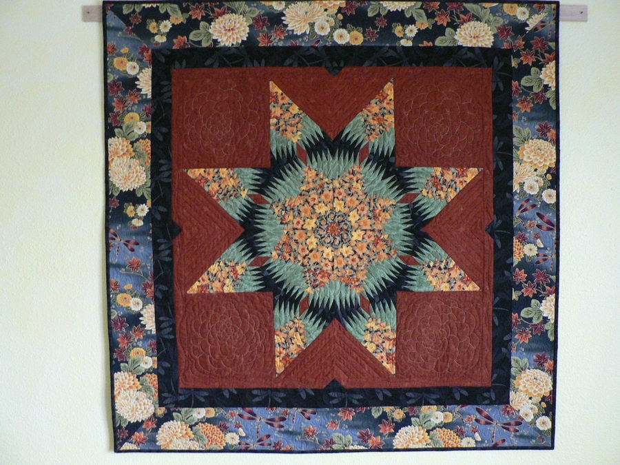 | Design Source - Description | Oriental fabrics with florals spinning in the center of this foundation pieced star. The borders have dragonflies and the flowers from the border are repeated in the quilting design. |