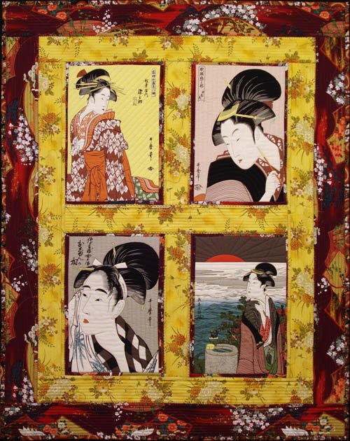 donlusk Geisha Portraits - Problem: I knew quilting the portraits would be difficult. The lines are so delicate that I knew it would require careful stitching and pivoting - and I was not looking forward to quilting delicate lines while wrestling with a big quilt sandwich. Solution: The Cotton Theory method allowed me to quilt the piece in small units, then assemble them with the sashing and border units.