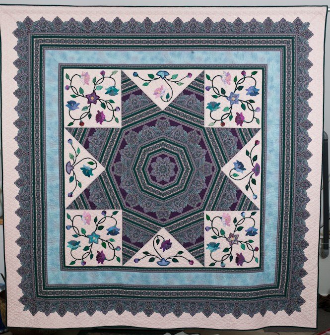 bbquiltmaker Lone Star Garden - Uses a striped fabric to create the large center star. Applique designs adapted from Pat Campbell's Jacobean Applique designs. The outer border is soft-edge pieced with the Jinny Beyer border stripe fabric. I bought 15 yards of the border stripe over several trips to the store to be sure I had enough.