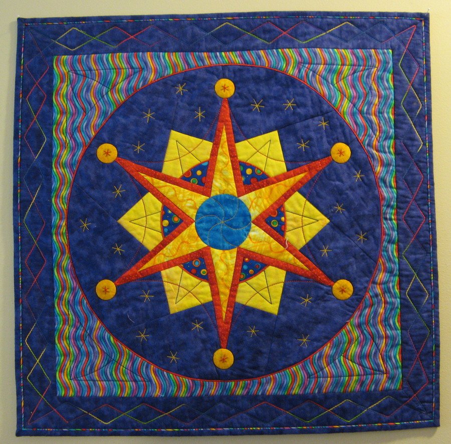 synneva Carnival Star - This quilt was started in a class from Susan Cleveland. The piping in the binding is the background fabric cut on the bias.