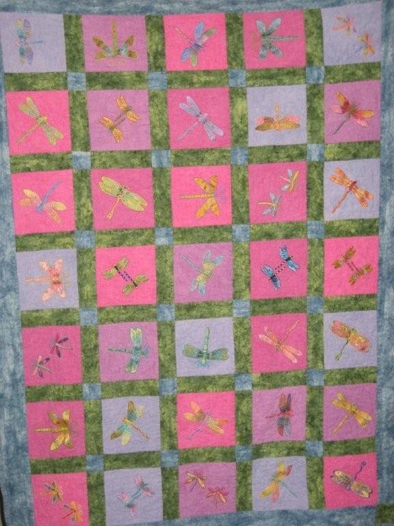 | Design Source - Description | I made this quilt for my new grandson Tommy. Blocks are machine embroidered with a variety of dragonflies. Fabric is hand dyed from Cherrywood Fabrics. |
