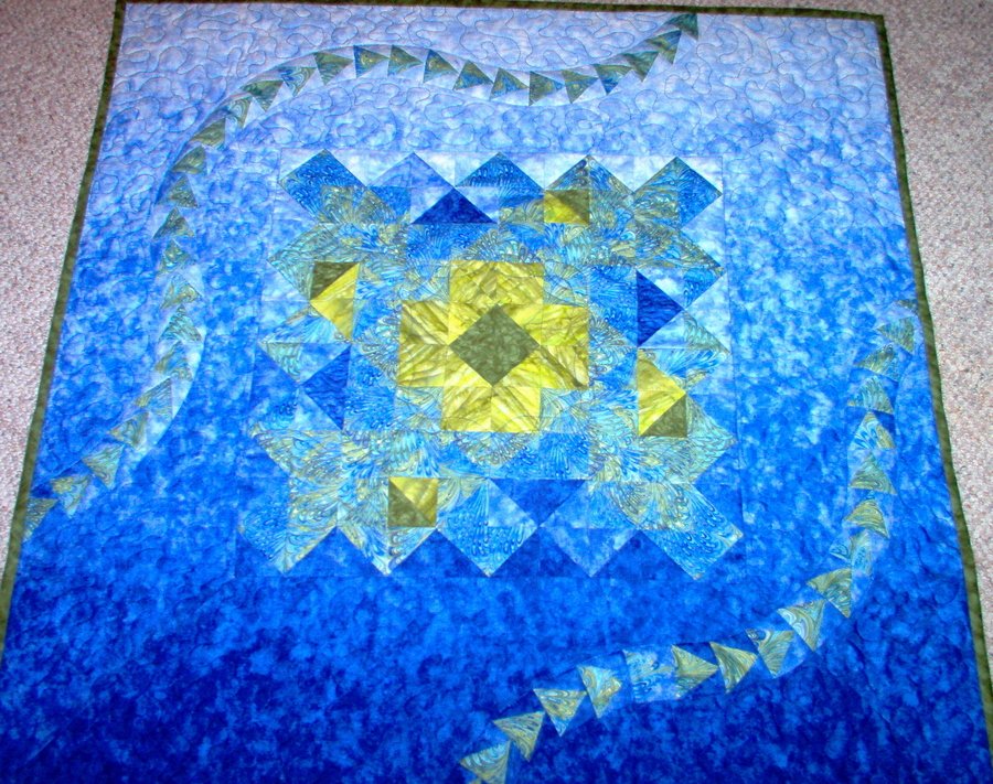 SusieQ28 Color My World - Challenge Quilt for Fabric Carosel - Illusions of Color 2007 Used 3 challenge fabrics and added 1 more fabic. Center of green with greens and blues radiating out to all shades of blue with flying geese in the borders.