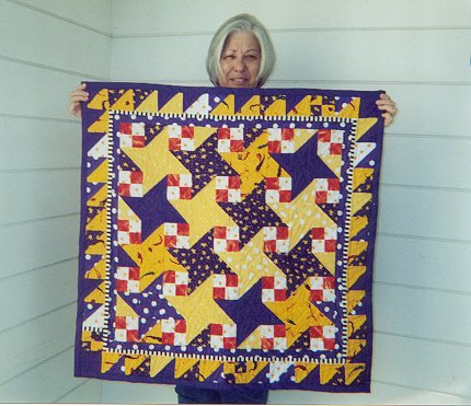 Robindg YOP - This YOP quilt I made in a class at Asilomar one year. I forget the teacher's name at the moment! I call it YOP for = yellow, orange and purple quilt. I wasn't thrilled using the orange but at the teacher's urging, I did. My friend Judy liked it so much (why, I don't know :P ) so she owns it now. :)