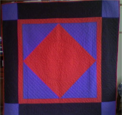 Robindg Amish Bullfighter - This quilt was made in Alex Anderson's first class she ever taught at Asilomar. It was a hand quilting and quilt design drafting class and we chose from a variety of Amish patterns. She taught us how to draft feathers and cables and transfer them onto the fabric. I call this Amish Bullfighter because I never really liked the shade of purple I used. I would have liked a darker color. It reminds me of a color a bullfighter would wear or his cape. :)