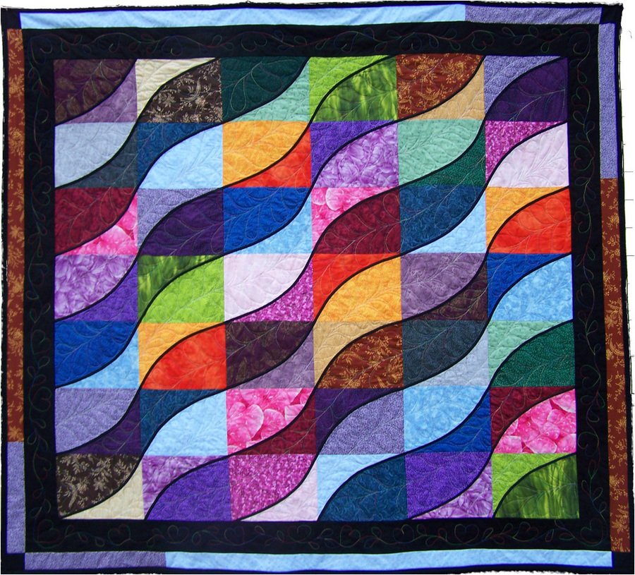 Raggede Candy Jo's Rainbow - This quilt went together quickly, I even had some of the same fabrics in my stash. I used 1/4" black bias stitched on with a double needle between the dark and the light values to highlight it more. I used multi-colored thread on the black border and on the dark parts. Made for a wedding gift and named for the recipient.