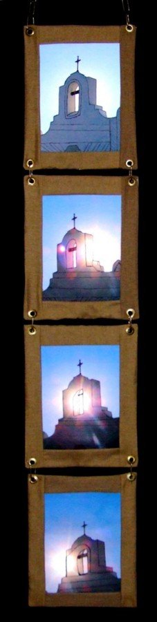 Sunrise photographs my son, ( JerryMac Lochala), took at a mission close to Houston. I printed them onto fabric and enhanced the fabric pictures with quilting and fabric frames. Lots of Fun! |