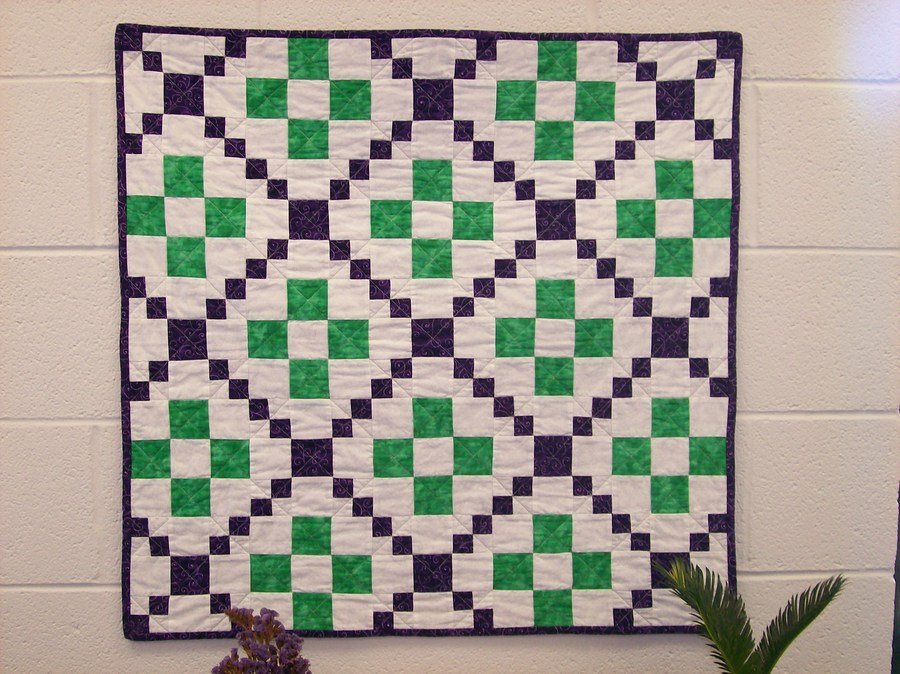 TinaB My 2nd quilt - This was the second quilt I made in my beginner quilt class. The picture doesn't show the color well but it's dark purple and green.
