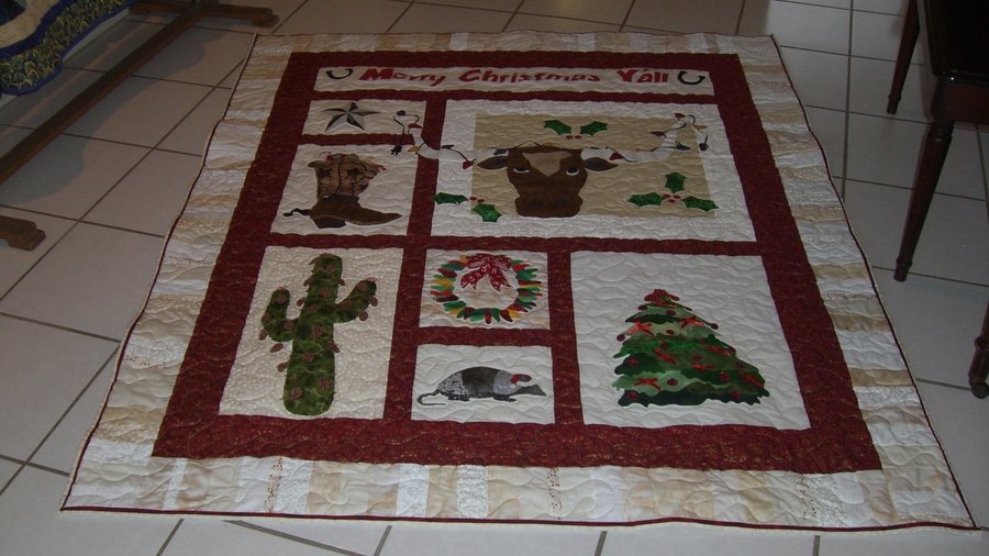 Pskye Merry Christmas 2007 Y'all - An absolutely enjoyable quilt to make. Collecting different fabrics for each entirely different block was fun. Sewing around each fusible piece was time consuming, so it did take awhile to get that done. Making the piano keys from the white and off-white backgrounds from the blocks seemed to be a nice border solution. However, adding the red accent seemed to be needed. I've had good response. It was made with my daughter and 4 gr ch in mind. They can have it next year--maybe! lol