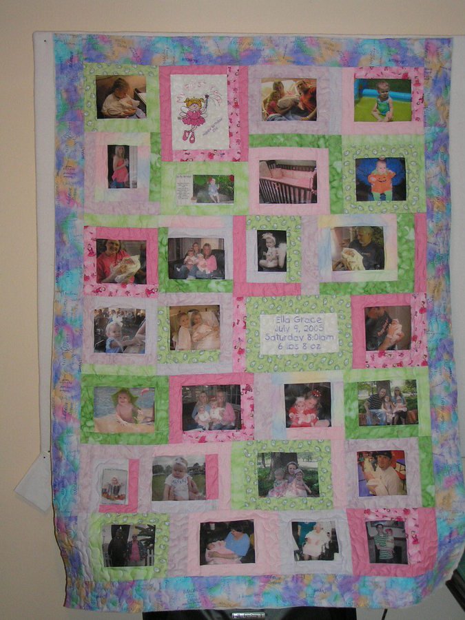 lyndalongarm Ella's Memory Quilt - My granddaugher's quilt I made her for her 1st birthday. Pictures of her first year even before she was born (upper left corner pic of daughter-in-law pregant). Even have pic's of her great grandmother and great-great grandmother (still living).