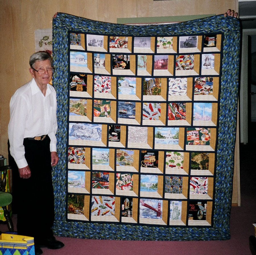 | Design Source - Description | Each window contains a family vacation photo, scene of places we visited, or other travel-related themes, in this quilt I made to thank my dad for family vacations all over the US when we were young. He loves it! |