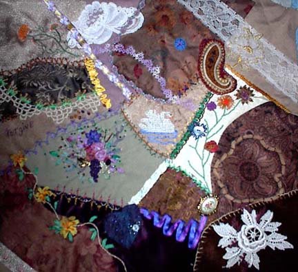 | Design Source - Description | Crazy Quilt done all by hand. Silk ribbon emb., tatting, punchneedle, calligraphy, silk thread emb. |
