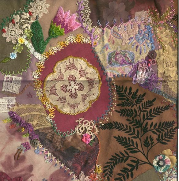 LilaMoon crazy ferns - sold on ebay, as were all the others. applique, silk ribbon embroidery, punchneedle, antique lace, yoyo's