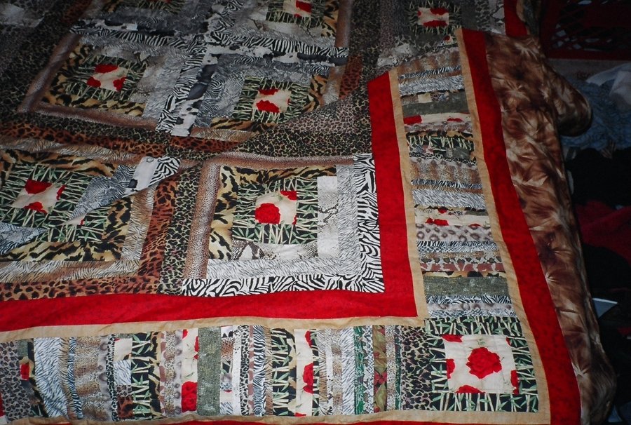 EBF1224 Inner Animal (and Roses) - Quilt made for my oldest son who stated a desire for an assorted animal print quilt while in college. He has used this quilt as a canapy over his bed, as a wall handing, and, of course, on his bed. It is fully reversible, with Alaskan animal scenes on the back.