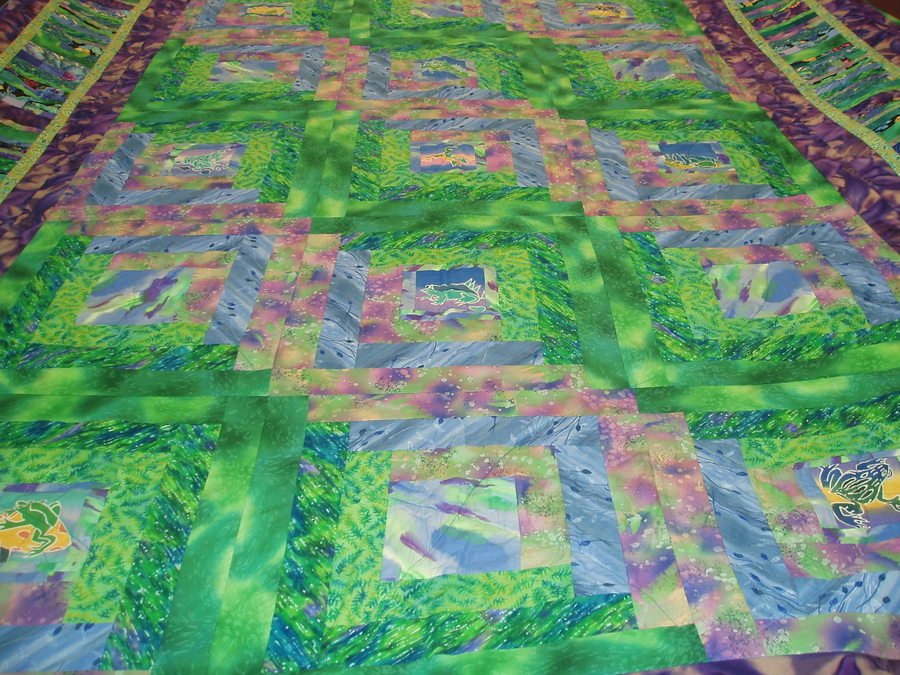 EBF1224 Frog Log Cabin - This quilt was disigned around the purchase of 9 4" hand-painted batik squares with frogs that my now daughter-in-law loves. Fully reversible, this quilt features bright bold colors and whimsical frogs on the back.