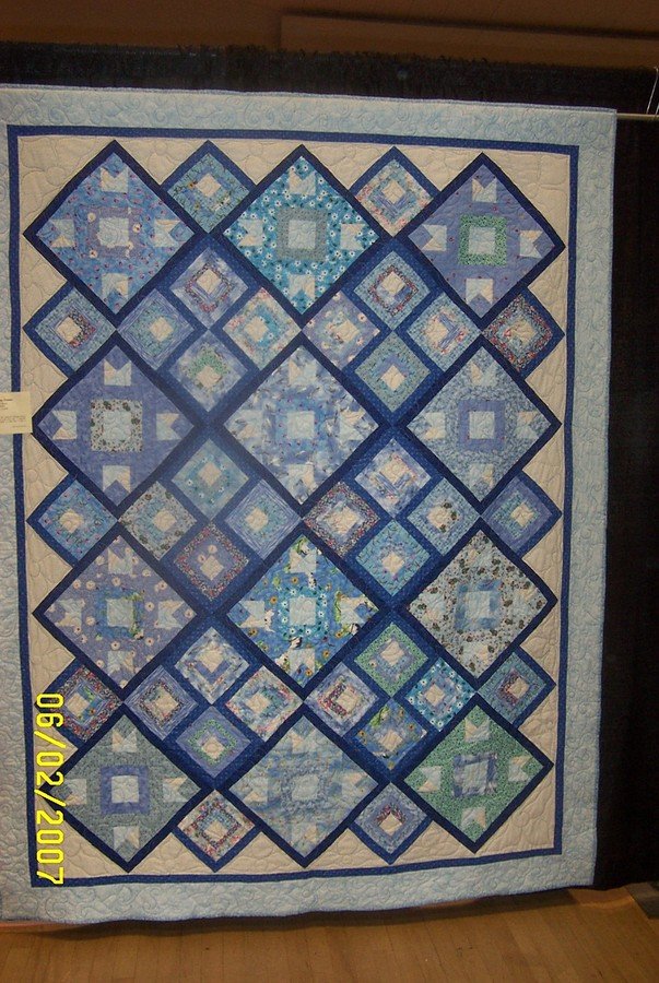 These block patterns were given out at each stop on our 2005 shop hop in the San Francisco Bay Area. I cleaned out my blue fabric drawer to make it. |