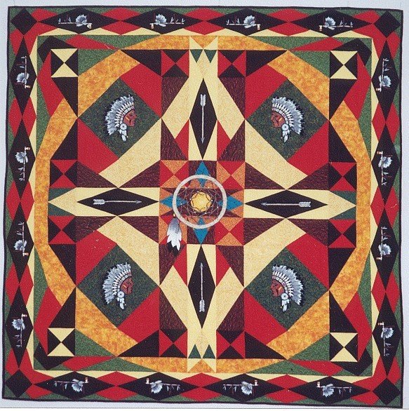 | Design Source - Description | Quilt is based on the block card trick and is in a camouflage form. The Indian head are all free motion machine embroidery. There is a story that goes with this quilt. |