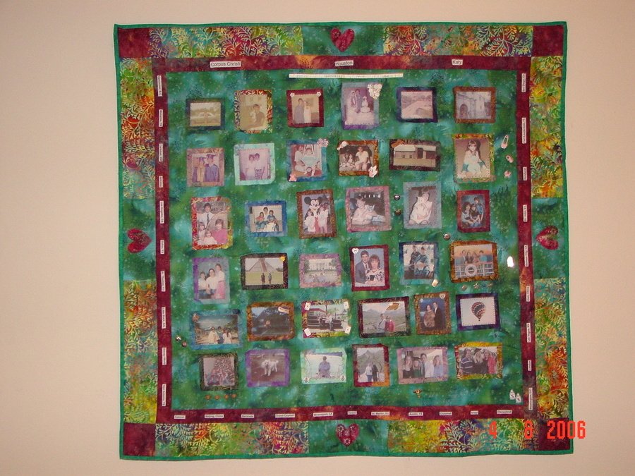 | Design Source - Description | Memory quilt for my husband for our 33rd wedding anniversary, 07/06/06. 36 pictures (one for each year we've been together) from dating, wedding, babies, vacations, pets, houses, etc. |