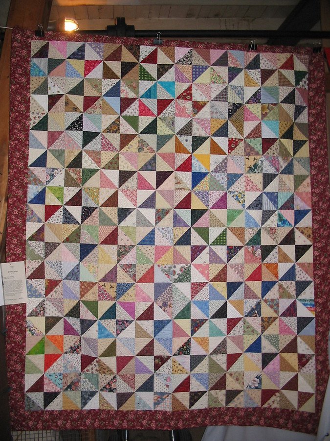 | Design Source - Description | 8" Broken Dishes blocks, set side-by-side (no sashings); scrap blocks made in a year-long block exchange; floral border; flannel back |