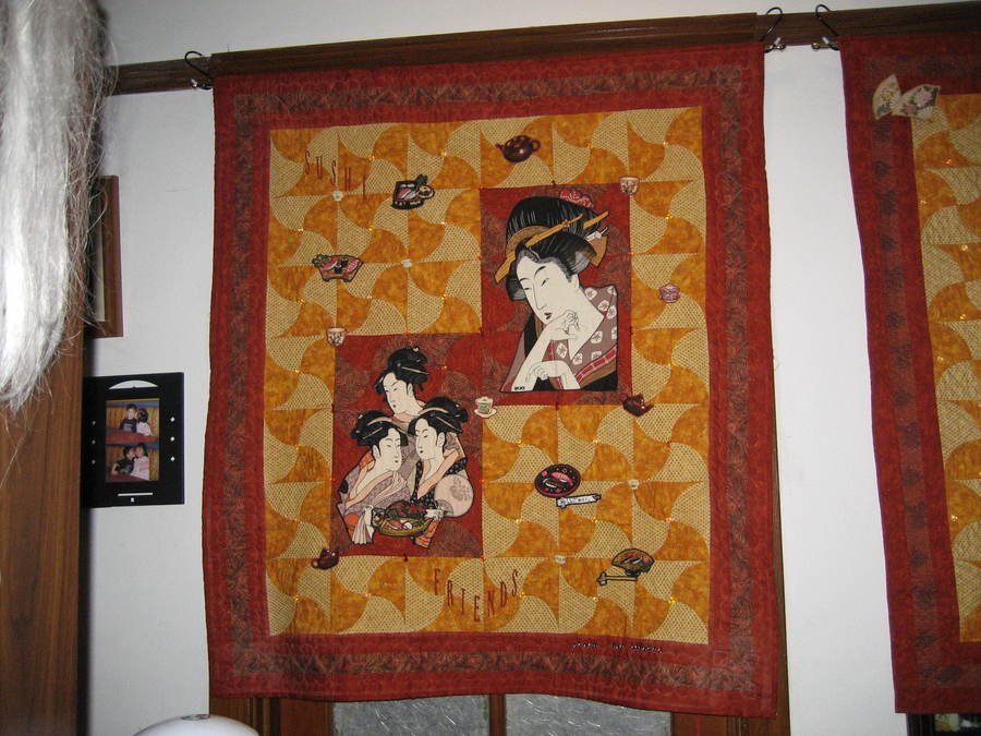 | Design Source - Description | #2 of series from the 4 panel fabric. Additional applique includes the three ladies from another fabric. Quilt is embellished with fabrics with sushi print; teapots; and beads. |