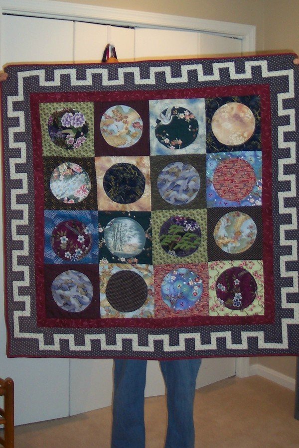 sueinoc Yin and Yang - I love oriental fabrics so I decided to make this quilt as a wall hanging for my foyer. The circles are machine appliqued. After auditioning hundreds of fabrics for the border, I decided to make this sort of greek key black and white. I'm very happy with the outcome.