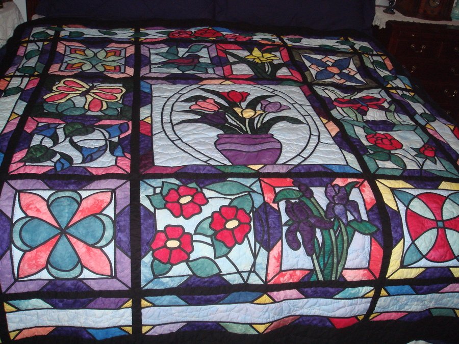 Joquilter A Stained Glass Garden - This quilt took a year to make. Loved all the colors in it. I hand quilted it. This quilt will be donated & auctioned at our church bazaar.