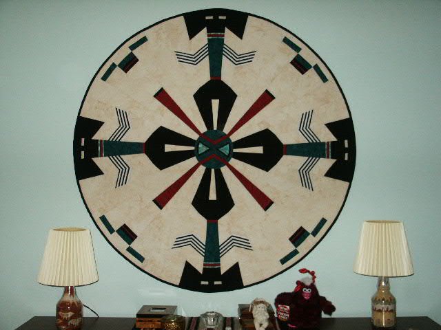 DesertQuilter Kachina Sand Painting - I was intrigued by Cheryl Phillips' circular quilts in her book, Quilt Without Corners, and loved this one, using the 9 degree ruler. It was quite a challenge to piece so I learned a lot. The designs in the center circle, as well as the center circle itself, were appliqued onto the top by machine. I really enjoyed quilting it on my Juki. It was also a challenge to hang, which was solved by hanging it on many "between" needles. Needless to say it doesn't come down often. I carefully dust it with the vacuum turned on low power. It really looks great in our bedroom, which was painted to coordinate with quilt.