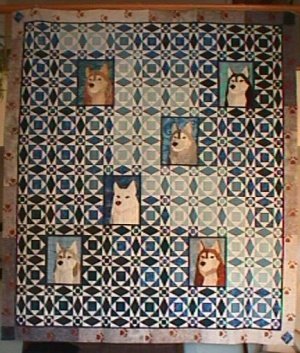 Waggs Save Our Siberians - Pat, Cheryl and her quilting group created a quilt which was raffled at SHCA Nationals in NY. The quilt background was "Storm at Sea" with a paw print border. It features six portraits depicting Siberian Huskies with various coat, eye and nose colours