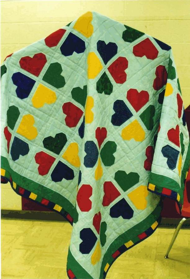 | Design Source - Description | Primary colored hearts on baby blue background. Quilted in the ditch 'cause I was in a real big hurry with a deadline! |