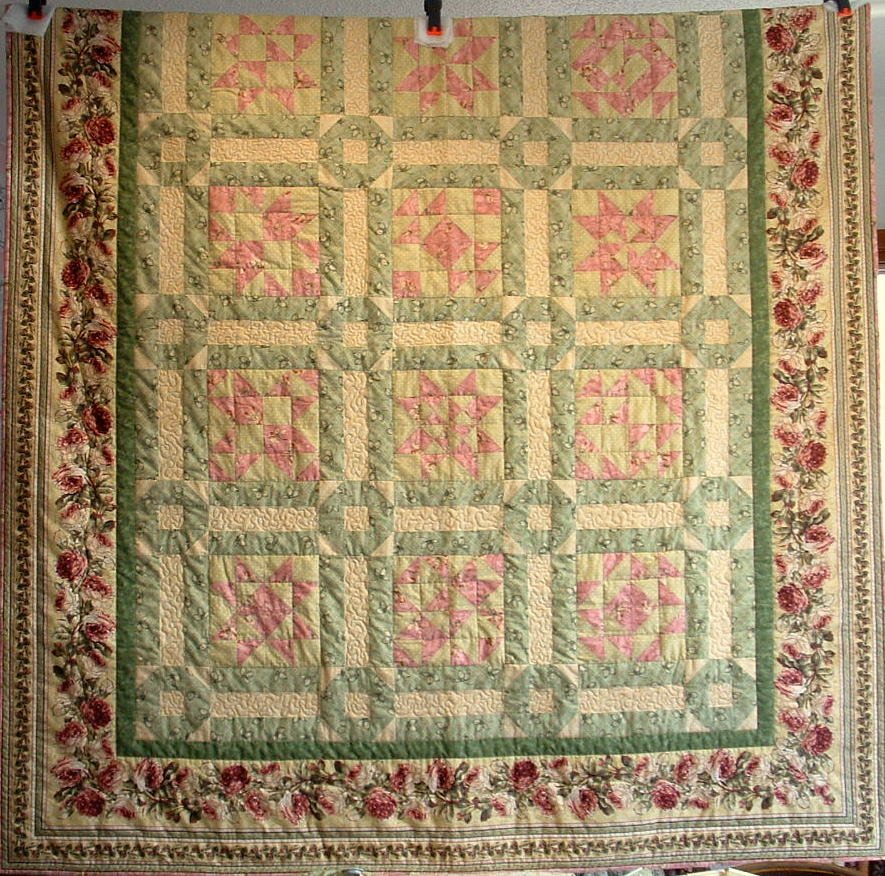 stitchesbyannie Starlit Rose - This quilt is done with the Willowberry Winter collection by Maywood Studios. It is full size and tones range from burgundy to pink and light moss green to dark hunter. It has 12 blocks with a pieced sashing and mitered borders.