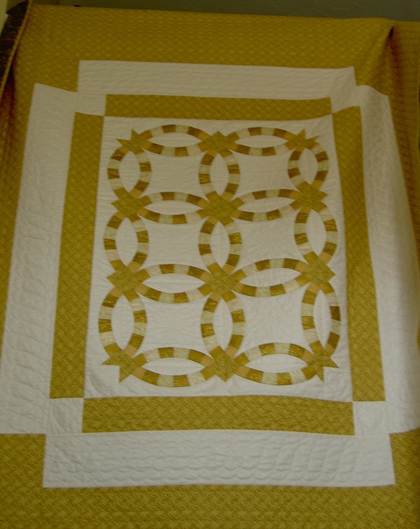 Pollymann Rings of gold - Double wedding quilt using fusible web applique adapted from the book 'Egg Money Quilts' by Eleanor Burns. The fabric for the rings was purchased as fat quarters at the International Quilt Festival in Houston. It was made to celebrate my parents' Golden Wedding Anniversary.