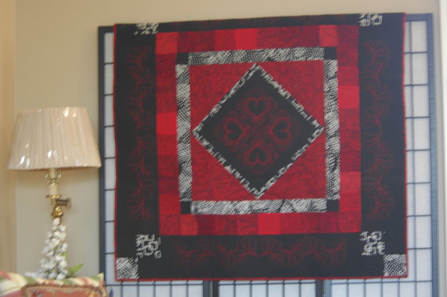| Design Source - Description | BlackWhiteRedAllOver was pieced and embroidered on a Bernina Hoop It All. I machine quilted it with the BSR. It was a gift to my sister, Becky. |
