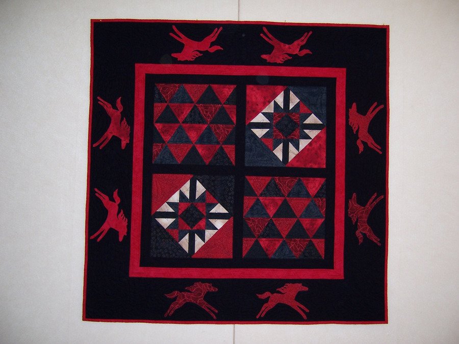 lonewolf Red Horse Roundup - I was learning to do machine applique and liked the bold, graphic design of this red and black southwestern quilt on the cover of The Quilter Magazine. I cut down the quilt to four blocks and used the red horses in the border to practice my machine applique. The triangle blocks turned out to be the most difficult part of the quilt, getting all those points to come together. It was a lot of fun working on this quilt. I've already made two of these wall hangings and plan to make more.