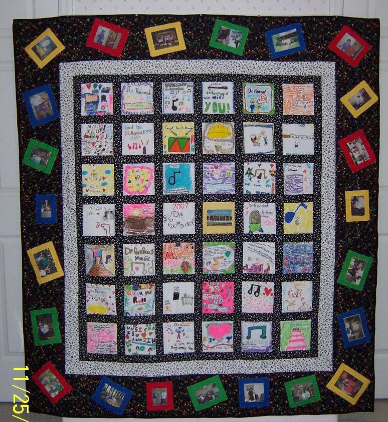 barbi Music Teacher Memory Quilt - Interior blocks were created by elementary students using dye markers on white cotton. B/W music themed companion fabrics were used as sashing and internal border. Sentimental photos were printed on fabric and outlined with primary colors. They were then attached to the outer border. Long-arm quilter, Su Smith, used music notes and meanderings to complete the piece.