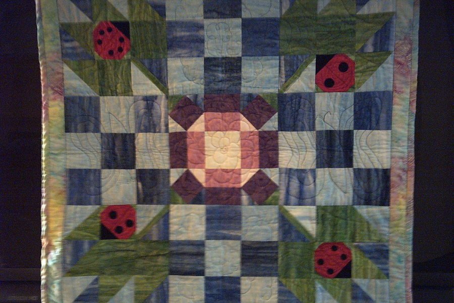 Guinnyd Lady Bug's Delight - I found the ladybug maple leaf block on the web, I don't know where, sorry. I used the Rolling Stone block, because it resembled a flower. The backing is baby pink velour so it is very soft. I made this quilt for a friend having her first baby. She had a beautiful baby girl named Isabella. Bella has Down's Syndrome, I hope the bright colors and shapes in this quilt will bring her great joy.