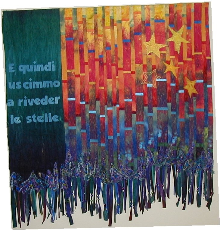 ardyt Out of the Inferno - "Out of the Inferno" celebrates my daughter's recovery from a deep and frightening depression. I used fabrics from Caryl Bryer Fallert and Heidi Stoll Webber to symbolize rising from the dark of depression into the light. The fringe on the bottom is ultrasuede, torn fabric, beads and thread lace made from sewing on washaway stabilizer. The words, from Dante's Inferno, in Latin, translate as AND WE CAME FORTH AND ONCE AGAIN BEHELD THE STARS. I machine quilted it to look like fire.