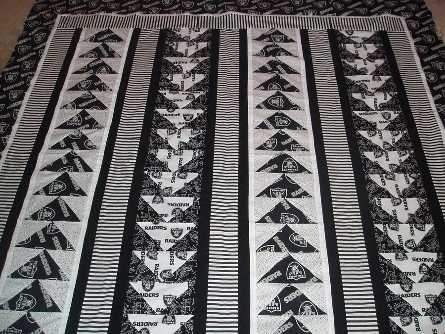 EBF1224 James' Raiders - My friend and co-worker loves the Raiders. I quilted this with football terms and names of former and current Raider coaches and players, and also inserted the names of rival teams that his friends and family love. The striped fabric represents the referees. It's backed with silver and black Minkee and velour, and has become a family favorite for snuggling.