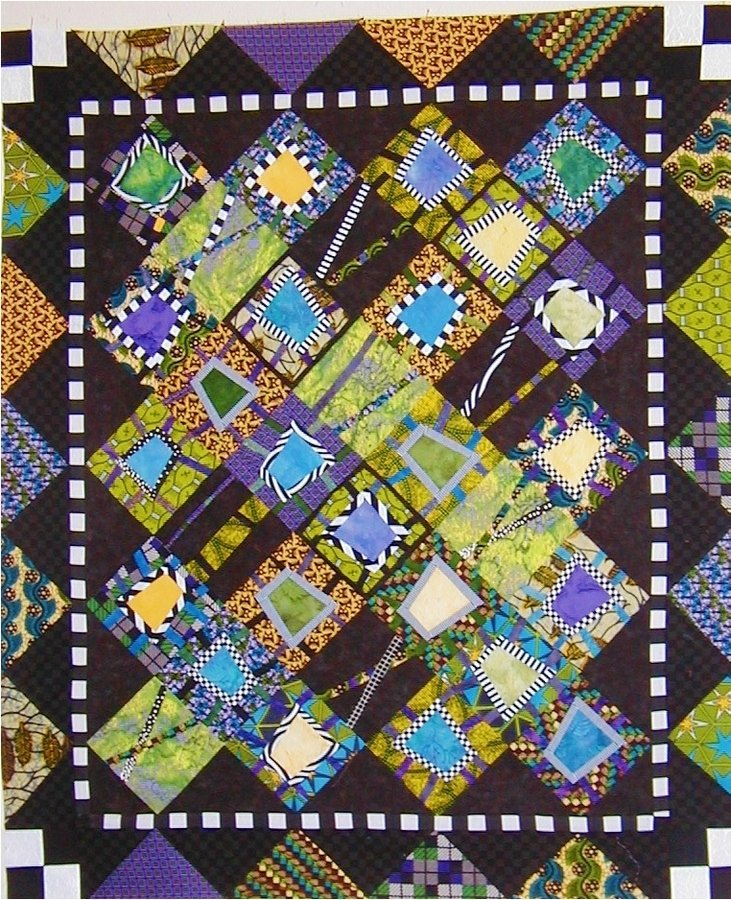 ardyt Out of Africa Baby - I wanted to make a quilt for my daughter's best friend's baby. The friend, Lisa, has a masters in African art history. I didn't think I'd like working with African fabrics but soon fell in love the with patterns and bright colors. Sandy Cummings book provided the ideas. The design is mine. Lisa loved it!!!