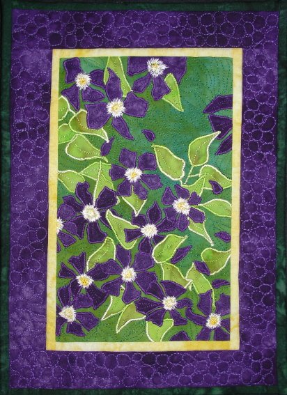 quiltedvalley Purple Passion - Original Floral Design- I used a photograph of clematis growing on a garden trellis for inspiration. It is free-motion machine appliquéd and free-motion quilted. This piece represents healing and new growth both physically and spiritually and the recovery process following major surgery.
