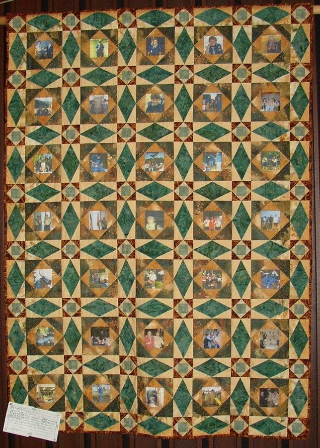 quiltinspace Memories of Scouting - I made this quilt to celebrate my youngest son becoming at Eagle Scout. The center of each block contains a photo of my son in a scout activity starting when he first started cub scouts. I quilted it using ideas that were significant to quilting. Choosing the pictures to include was like a trip down memory lane.