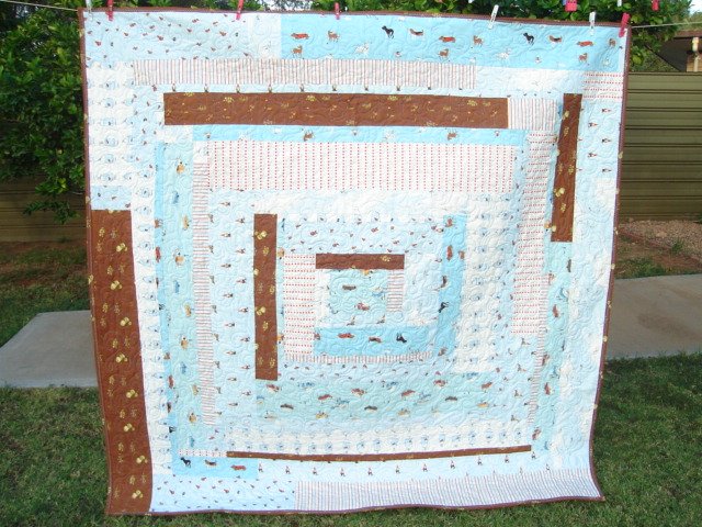 Campfollower8 Ethan's Summer - I was flipping through Martha Stewart's "Blueprint" magazine and found a pattern for Joelle Hoverson's (of Purl Patchwork) bedroom quilt. I have been hording Heather Ross fabric for years and new this would be the perfect quilt to display the wonderful prints I am ready to put in a project. I have prints from Munki munki, Lightening Bugs and other Mysteries. I know it was ment to be when the quilt almost came together by itself. The back is a big beach print with snorklers, fish, people getting sunburned....a lost turtle. Heather Ross is able to depict my childhood in art, I just love her work. I batted the quilt with an organic cotton/wool batting that is made here in Australia and I quilted it with King Tut thread in a verigated blue. I used my signature "Determined Meandering" technique and my Bernina 640 was my sewing computer.